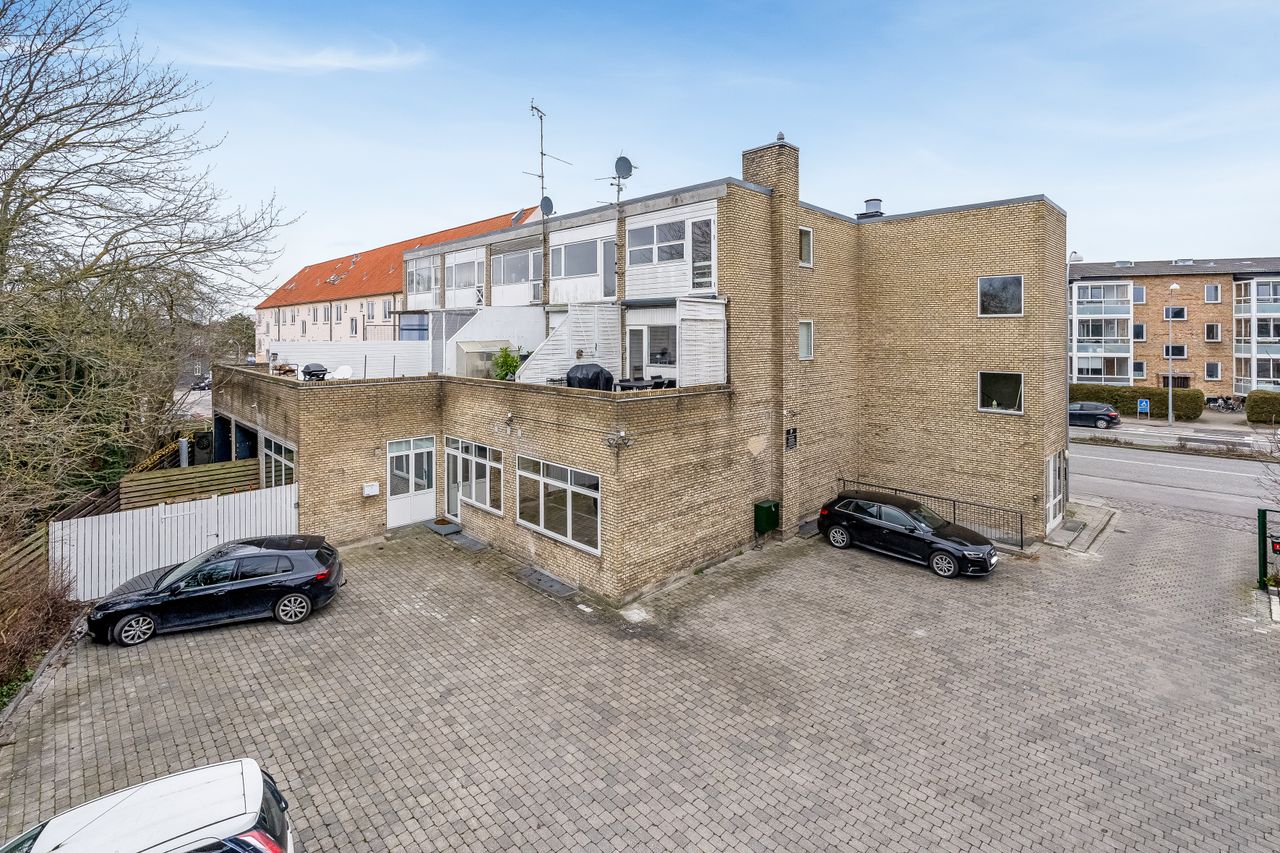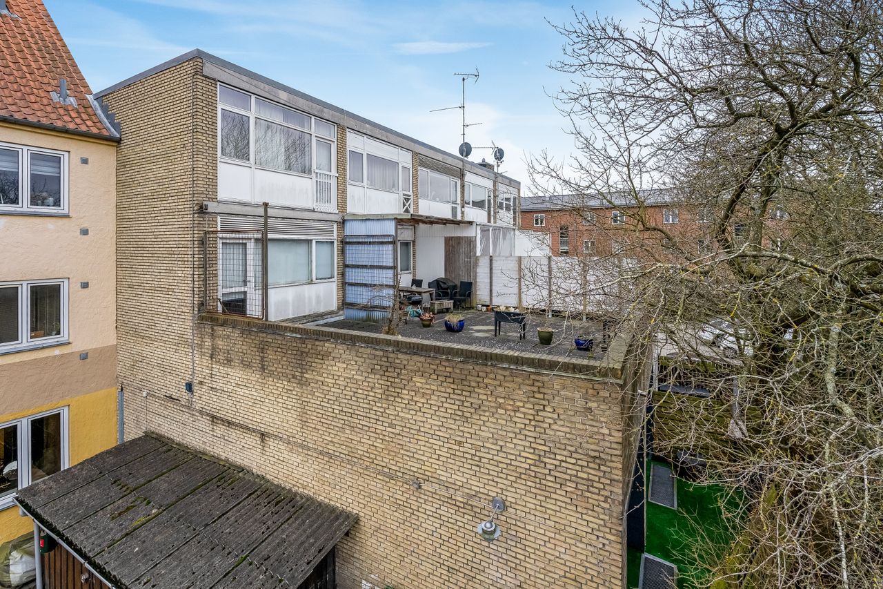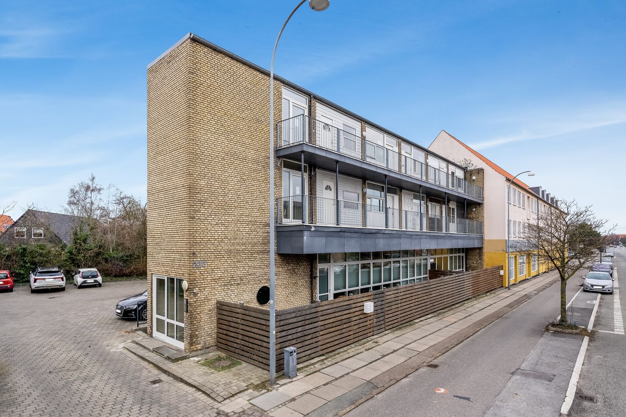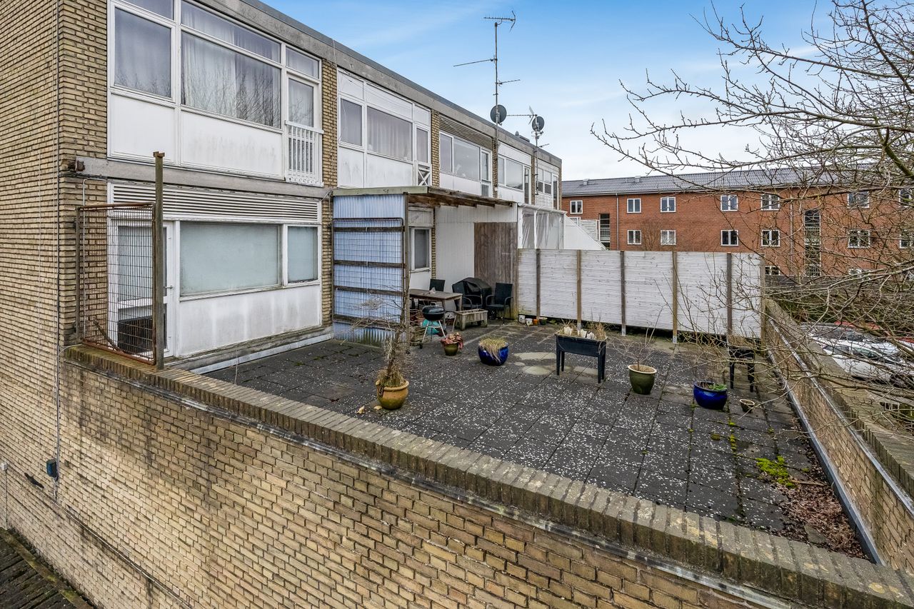 Ejendommen er arkitektonisk ikke den mest spændende, men til gengæld er den vel- og vedligeholdt, og lejligheden er på godt fordelte 52 kvm. og pt. 1-værelses, sådan som øvrige lejligheder i ejerforeningen oprindeligt var udformet. De øvrige er efterfølgende ændret til 2-værelses ved at etablere køkken i stuen, og soveværelse i det tidligere køkkenrum - dét er også muligt her. Det er den sidste lejlighed på svalegangen, så der er ingen forbipasserende, og så er der fra stuen udgang til egen og ret så stor terrasse på anslået 30 kvm.